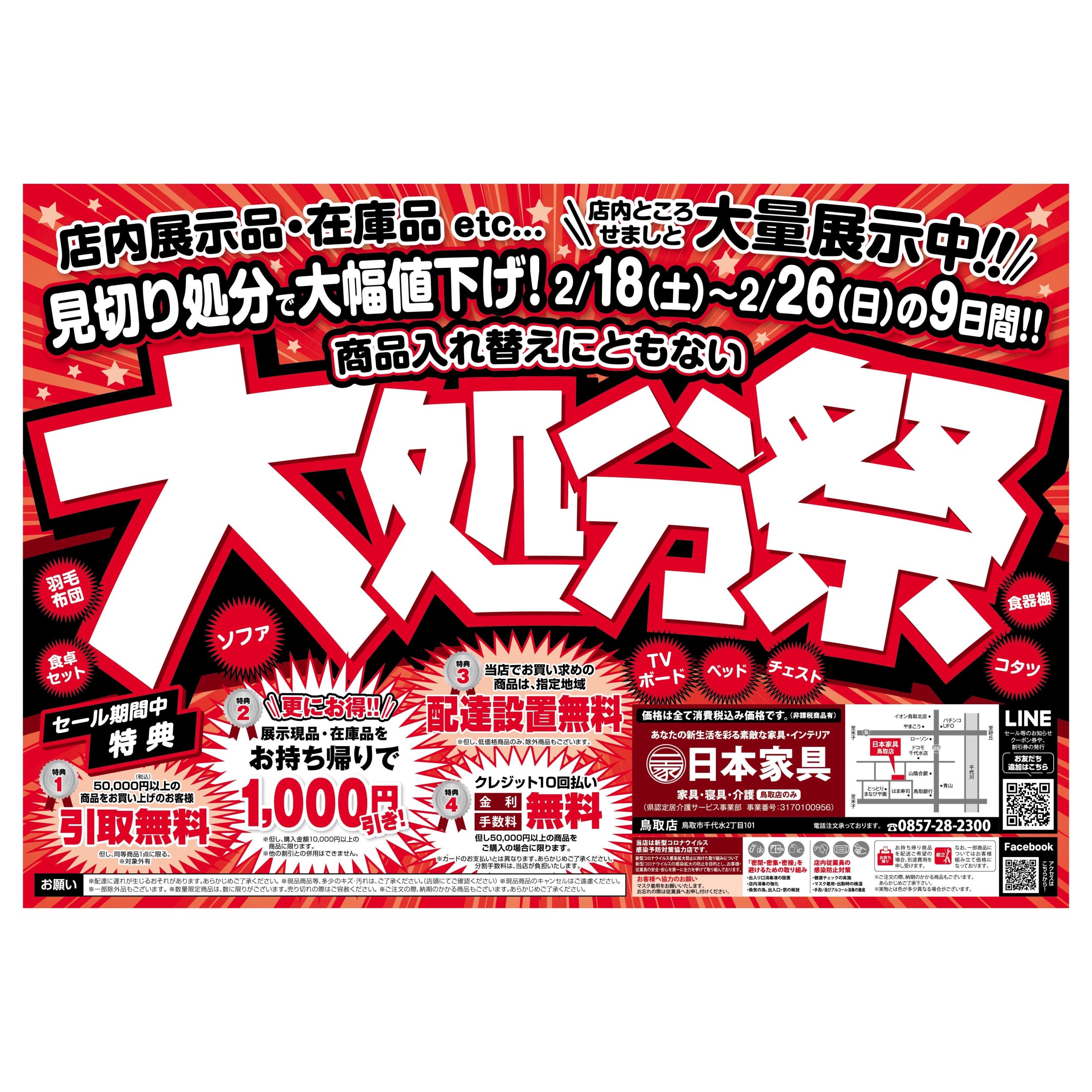 2月18日(土)から2月26日(日)までの9日間、店内展示品・在庫品等を見切り処分価格に大幅値下げした「大処分祭」を開催します。